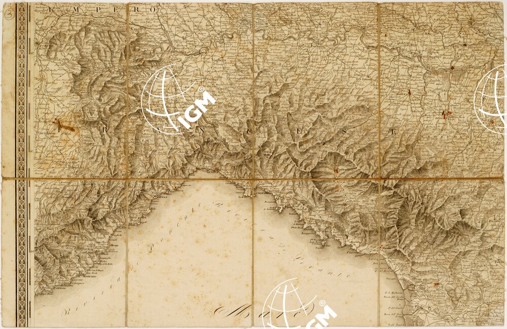 …COI SUOI STABILIMENTI POLITICI, MILITARI, CIVILI E RELIGIOSI E CON UNA PARTE DEGLI STATI LIMITROFI. COSTRUITA NEL DEPOSITO DELLA GUERRA PER ORDINE DEL MINISTRO DELLA GUERRA E MARINA NELL’ANNO MDCCCXI. AGGIUNTA E CORRETTA NELL’ANNO 1813. LA PRESENTE CARTA E’ STATA INCISA SOTTO LA VIGILANZA DEL SIG. G. BORDIGA CAPO INCISORE NEL DEPOSITO DELLA GUERRA.
