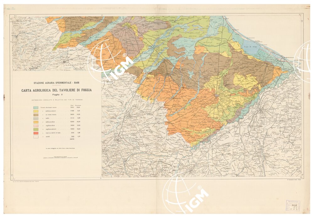 Rappresentazione orografica a curve di livello. Sotto al titolo è presente la spiegazione dei colori relativi ai terreni. Le zone tratteggiate con bistro hanno crosta discontinua. Stazione Agraria Sperimentale, Bari. Dai tipi dell’I.G.M. (FI) Stabilimento Cartografico G. Giardi, Firenze.