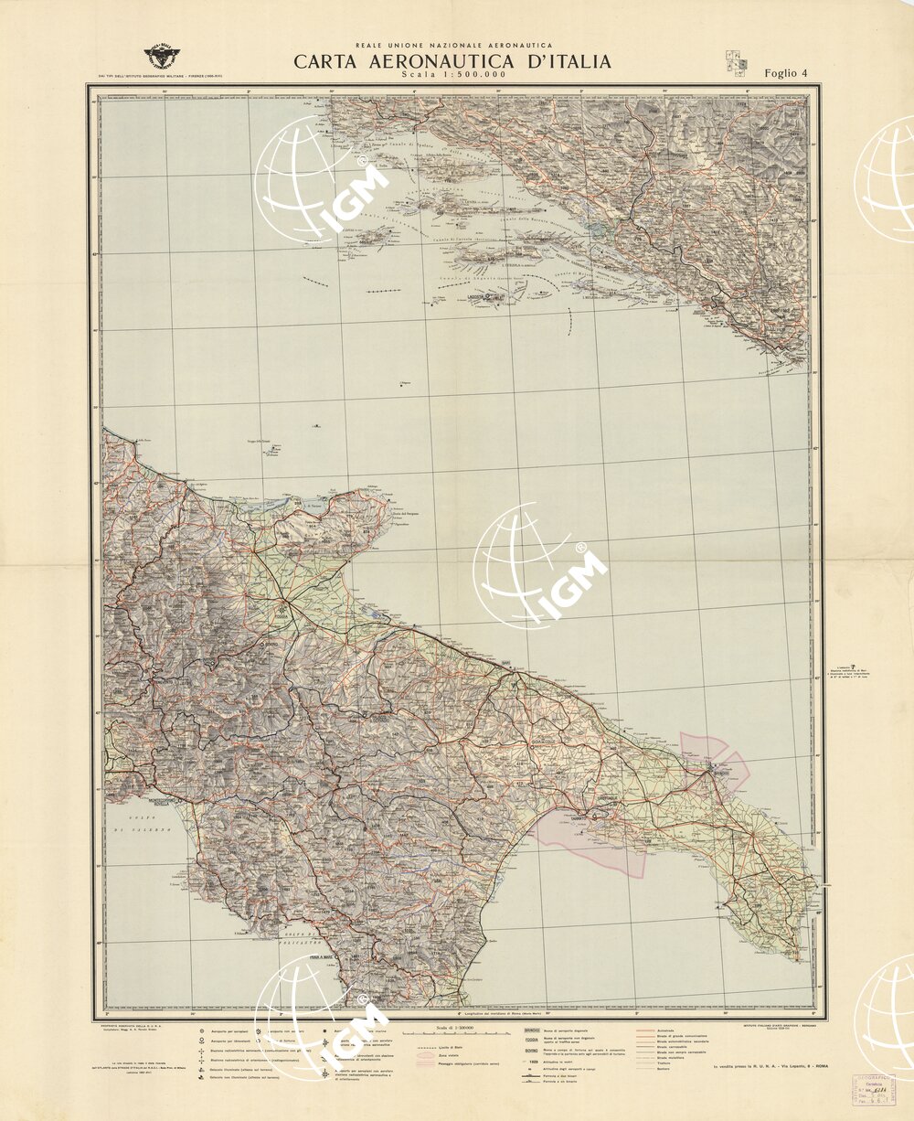 Edizione ad uso aeronautico della carta corografica d’Italia dell’I.G.M. di Firenze. Rappresentazione orografica a sfumo. In basso la legenda dei segni convenzionali. La rete stradale in rosso è stata ricavata dall’Atlante delle Strade d’Italia del R.A.C.I., sede provinciale di Milano. Originariamente carta in sei fogli più il quadro d’unione; i fogli esistenti al 6 giugno 1954 sono: 1, 2, 3, 4, 6 ed il quadro d’unione. Reale Unione Nazionale Aeronautica, Roma. Istituto Italiano d’Arti Grafiche, Bergamo.