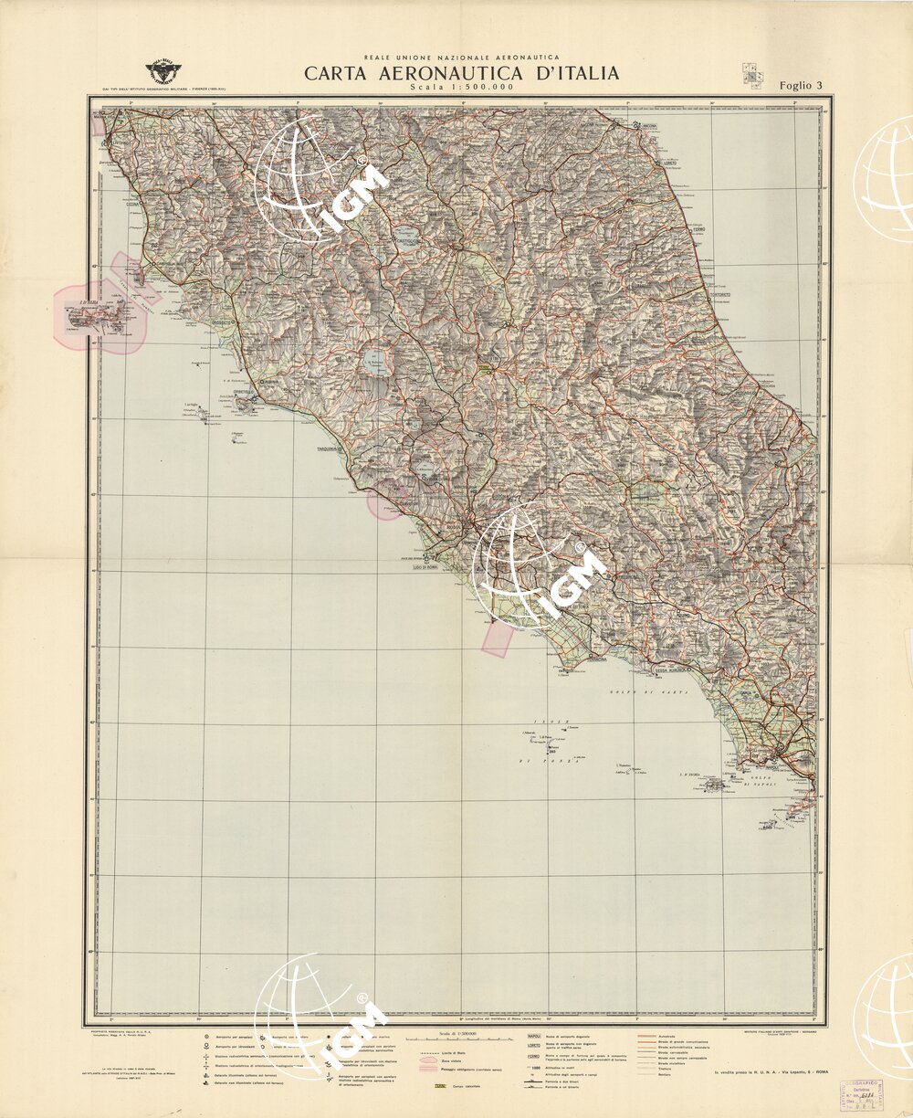 Edizione ad uso aeronautico della carta corografica d’Italia dell’I.G.M. di Firenze. Rappresentazione orografica a sfumo. In basso la legenda dei segni convenzionali. La rete stradale in rosso è stata ricavata dall’Atlante delle Strade d’Italia del R.A.C.I., sede provinciale di Milano. Originariamente carta in sei fogli più il quadro d’unione; i fogli esistenti al 6 giugno 1954 sono: 1, 2, 3, 4, 6 ed il quadro d’unione. Reale Unione Nazionale Aeronautica, Roma. Istituto Italiano d’Arti Grafiche, Bergamo.