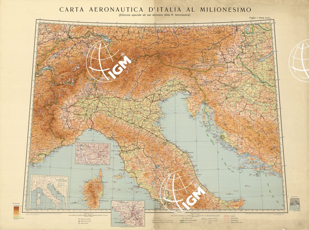 Autore Ministero dell’Aeronautica sezione Cartografica Com. Magg. Grasso. Rappresentazione orografica a tinte ipsometriche. Grafia in lingua italiana.Tipologia policroma.