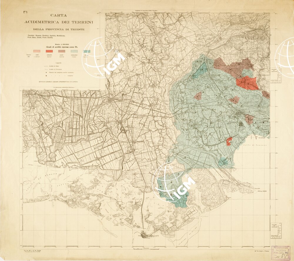 Tavolette: Romans, Gradisca, Aquileia, Monfalcone, Porto Buso, Grado, Punta Sdobba. Dai tipi dell’ I.G.M. Firenze – Riduzione dal 25 al 50.000.