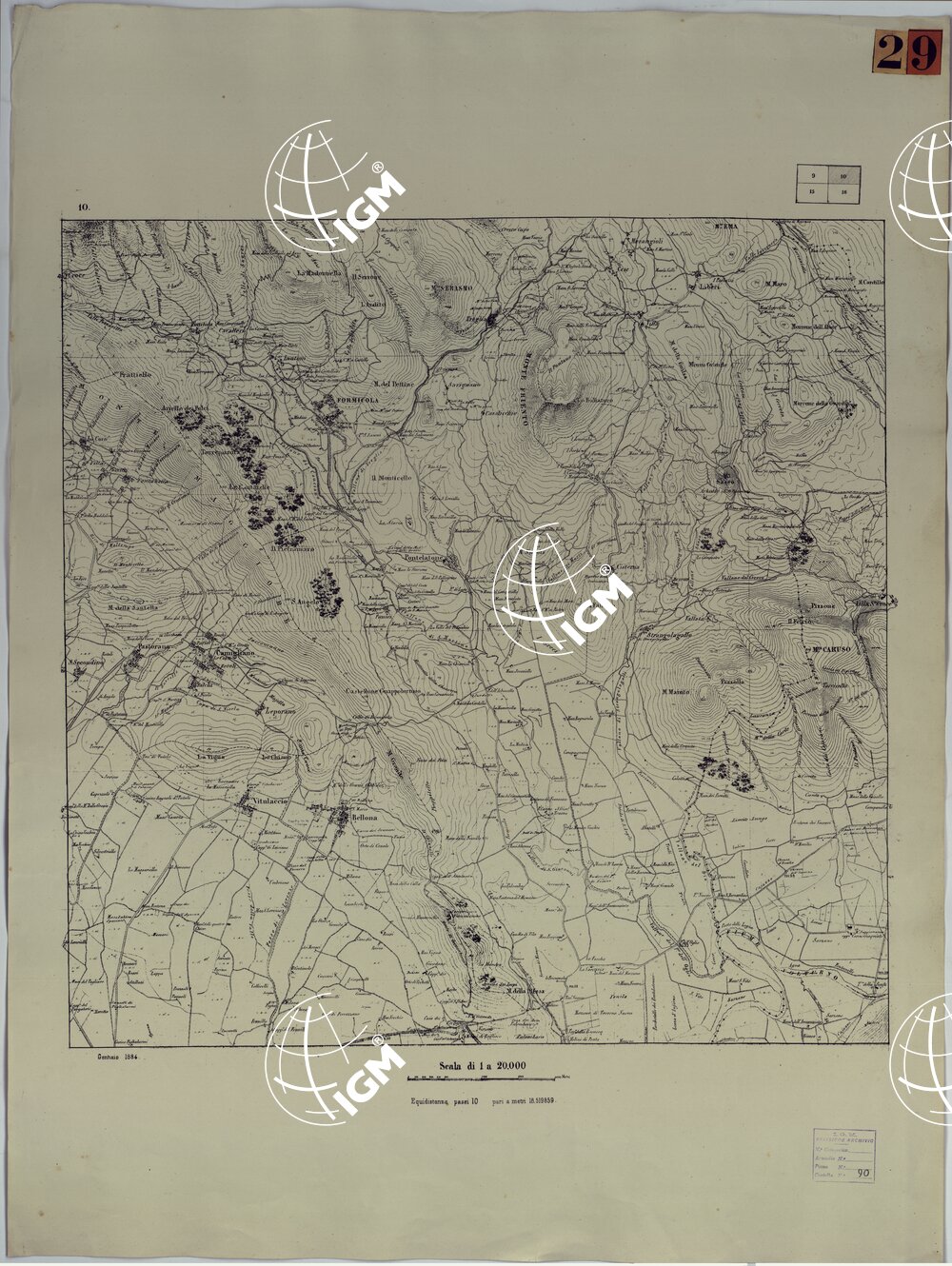 Carta in quattro fogli stampati in nero, con orografia a curve di livello tracciate all’equidistanza di 10 in 10 passi geodetici (m. 18,519859). Annesso un quadro d’unione. Due copie.