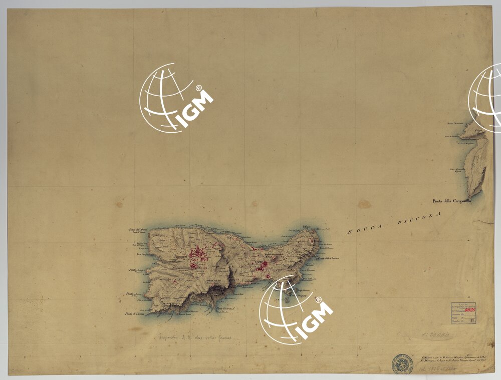 Disegno originale del rilievo eseguito da D. Francesco Morghen e D. Antonio Valmagini Topografi del R.le Officio Topografico di Napoli negli anni 1836-1840. Lavoro notevole per la nitida esecuzione del disegno: il rlievo orografico è rappresentato mediante fine ed artistico tratteggio: gli abitati sono in rosso: le acque in azzurro.