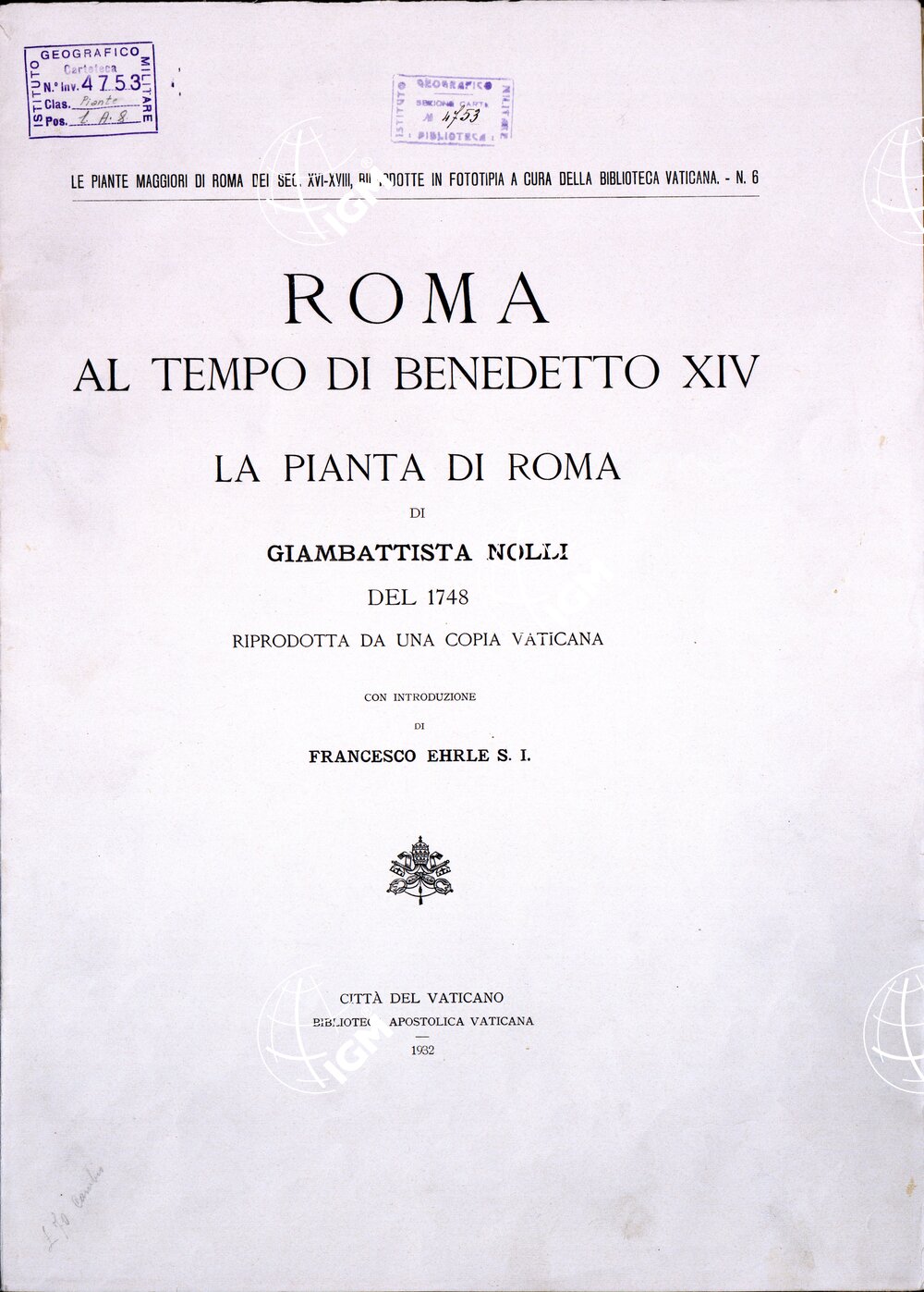 Riproduzione in fototipia da una copia vaticana della pianta costruita nel 1748 da Giambattista Nolli. Questa pianta è ritenuta “la prima delineata in grandiose proporzioni con geometrica esattezza” “e servì alla delimitazione dei rioni ordinata dal Papa Benedetto XIV. Riprodotta per molte volte in moduli diversa è tenuta in alto pregio anche dagli archeologi”. L’originale si compone di 12 fogli misuranti ognuno cm. 36×56. Il foglio II reca la dedica a Papa Benedetto XIV e i nomi Rocco Pozzi Romano, Pietro Campana da Soriano, e Carlo Nolli inc.; indi al margine inferiore della dedica “Misurata delin. ed a proprie Spese data in luce da Giambatta Nolli Geom.; ed Arch.° l’Anno 1748”. Sul foglio 9 è scritto “Si stampa in Roma con Privil. del Som.° Pontefice e licenza de’ Superiori”. Sul foglio 12 “Stefano Pozzi Pit. impr. delin.”. La riproduzione, che fa parte della serie curata dalla Biblioteca Vaticana, misura m. 1,34×1,60: è montata su tela a stacchi e contenuta in busta: è accompagnata da una introduzione di Francesco Ehrle S. I. (Le Piante maggiori di Roma dei secoli XVI-XVIII, riprodotte in fototipia a cura della Biblioteca Vaticana, che contiene anche i due ricchi indici dei nomi della carta uno per rioni ed uno alfabetico (un pregio anche questo della bella pianta del Nolli) e la riproduzione di una piccola pianta riduzione della grande dello stesso Nolli e da lui dedicata al Cardinale Albani nel 1748.