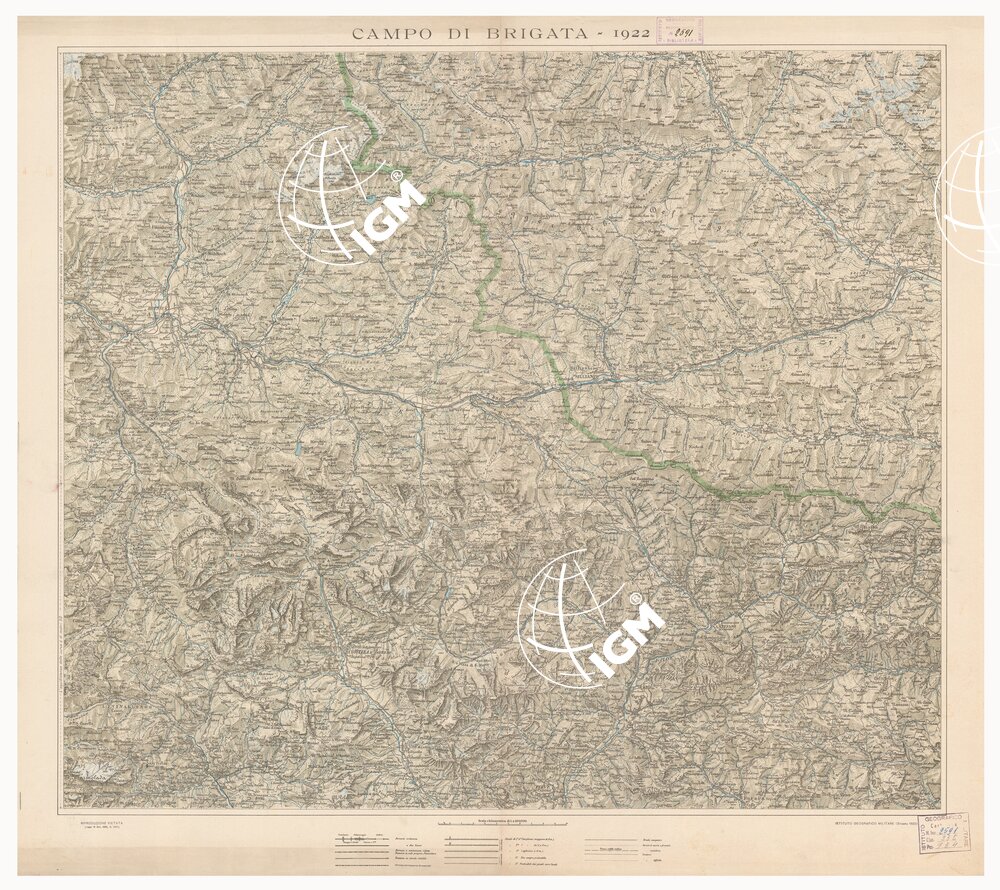 Rappresentazione orografica a curve di livello e a sfumo. In basso la legenda delle strade e delle ferrovie. I.G.M. (FI).