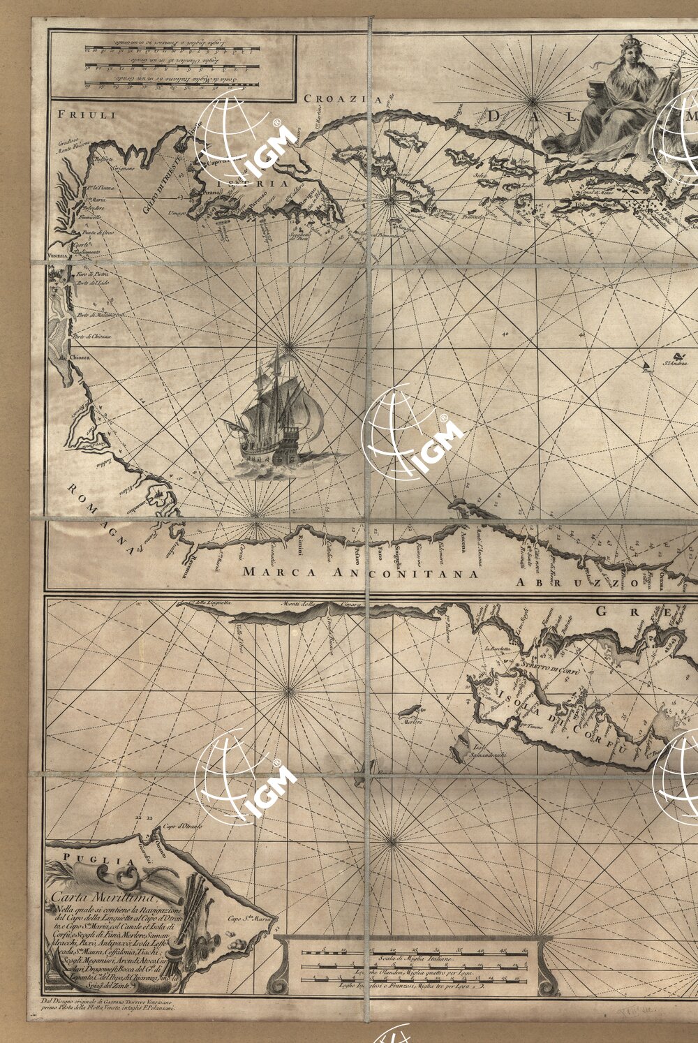 Due portolani riuniti in un sol foglio, montati su tela a stacchi. Il nord è spostato di circa 45° verso sinistra in ambedue le carte. Tre scale grafiche in miglia italiane, leghe olandesi, leghe francesi e inglesi.