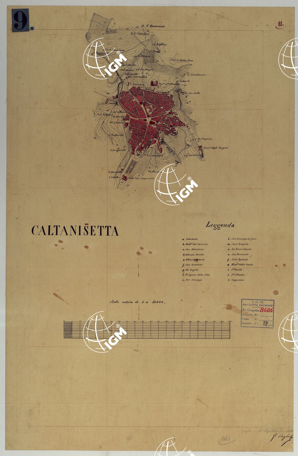 Docum. n. 9. Disegno originale della pianta rilevata dal Cap. di Stato Maggiore G. Bogliolo. Le costruzioni sono riempite in rosso; le curve di livello sono tracciate in nero alla equidistanza di m. 10. A destra un breve elenco delle principali costruzioni. Annesso un lucido cm 18×27.