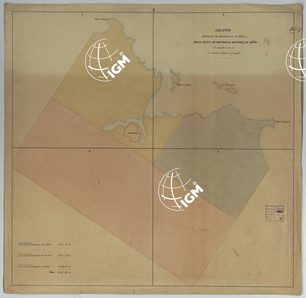 Quattro fogli montati su tela tratti dalle minute di campagna – Doc. n. 20 BRINDISI E DINTORNI. L'orografia è rappresentata mediante curve di livello tracciate all'equidistanza di m. 5. Le quote delle varie elevazioni sono calcolate in metri. Gli abitati sono in rosso; le acque in azzurro. Le strade sono distinte in cinque classi. Sono distinti, mediante lettere convenzionali, i vari tipi di colture. La pianta venne riconosciuta nel 1889. Annessi un grafico indicante la distribuzione dei fogli e le superfici levate da ciascuno operatore e una fotografia della pianta ridotta al 20.000 nel 1870.