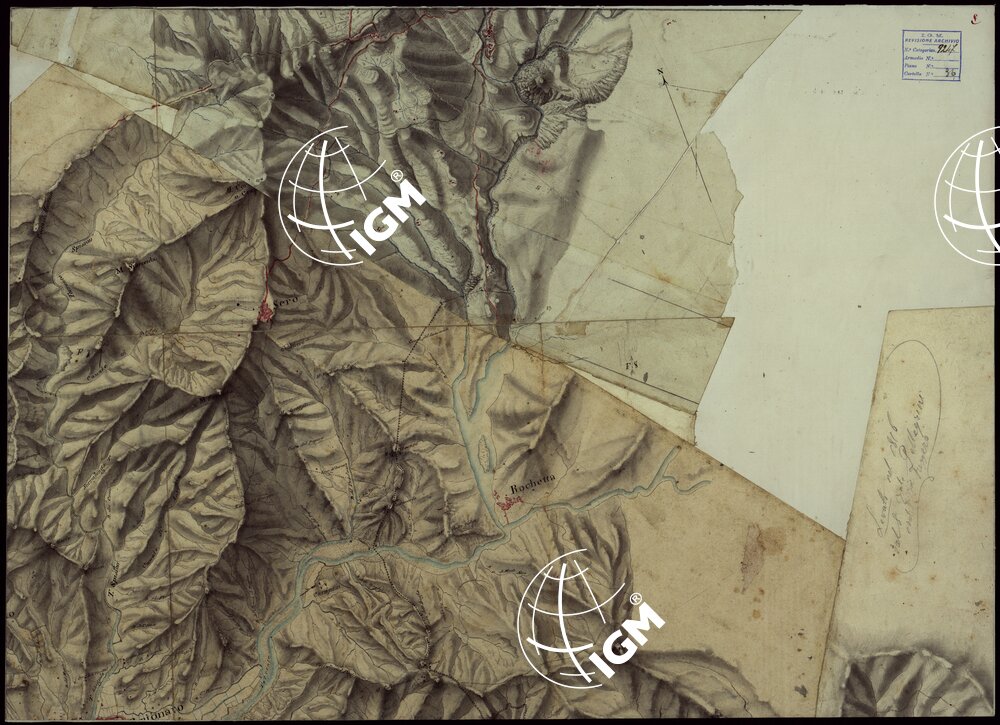 | Note foto | Ventun fogli, e un quadro d'unione, disegnati ad acquerello, a luce obliqua, composti a mosaico e montati su tela. Una nota a lapis sul foglio 5, fa supporre si tratti di rilievi originali di campagna eseguiti dal 1815 al 1816. |