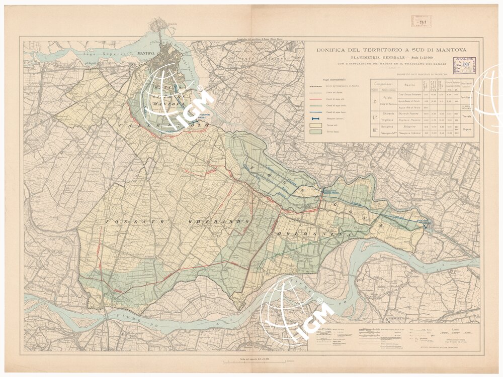 Con l’indicazione dei bacini ed il tracciato dei canali. Rappresentazione orografica planimetrica. Ed. I.G.M. (FI).