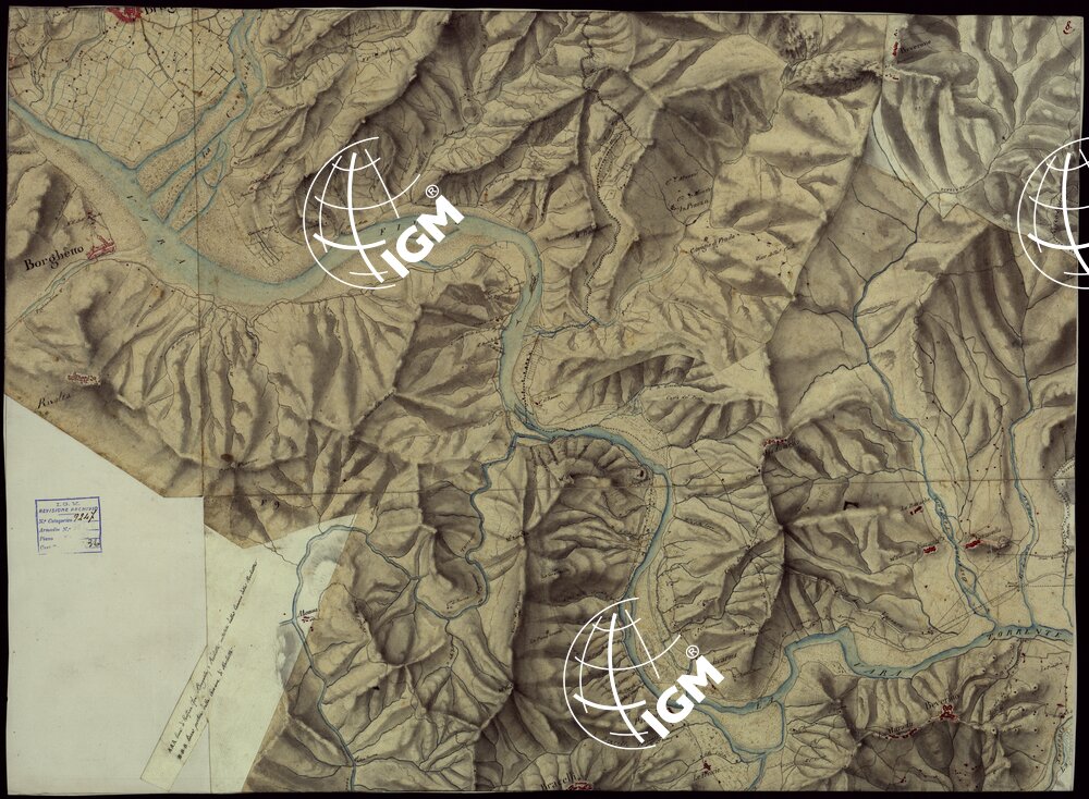 Ventun fogli, e un quadro d’unione, disegnati ad acquerello, a luce obliqua, composti a mosaico e montati su tela. Una nota a lapis sul foglio 5, fa supporre si tratti di rilievi originali di campagna eseguiti dal 1815 al 1816.