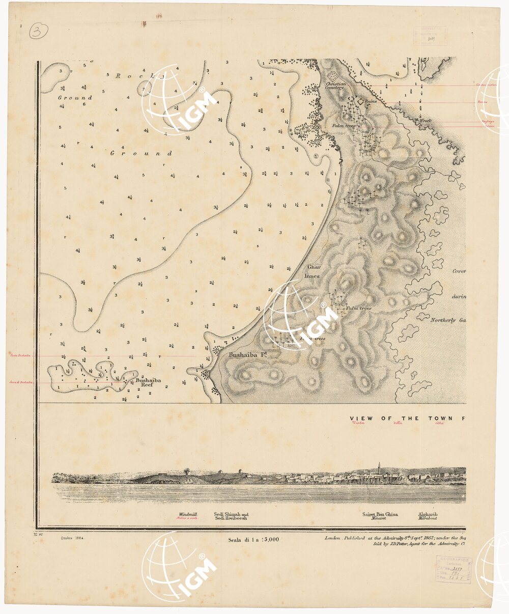 Carta in 4 fogli stampati in nero con aggiunte a mano (traduzione). In basso nei fogli n. 3 e 4 vi è la veduta della città di Ben Ghazi. I fogli n. 3 e 4 sono stati ristampati nel 1978. Ammiragliato Inglese, Londra.