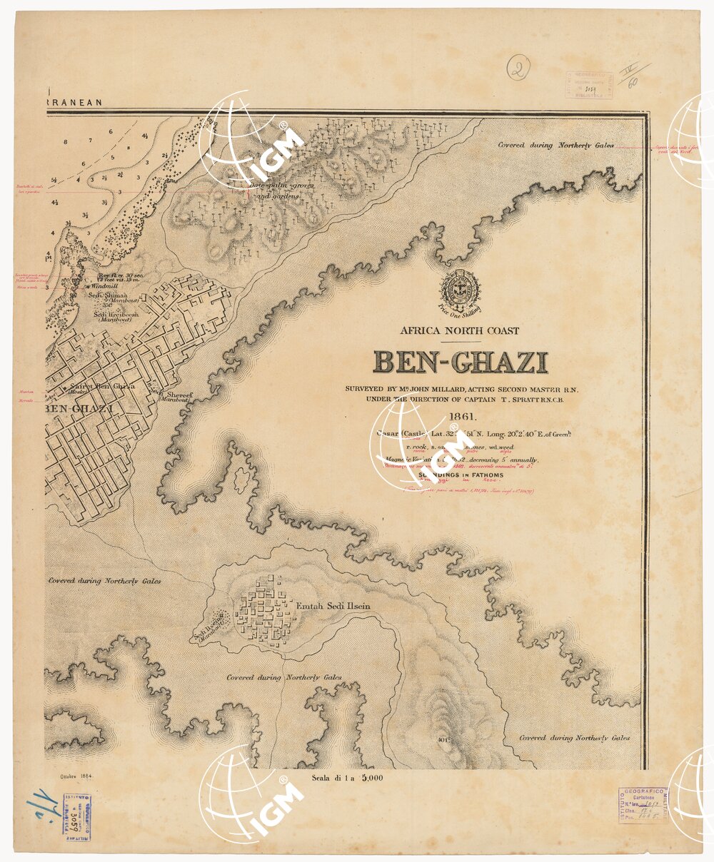 Carta in 4 fogli stampati in nero con aggiunte a mano (traduzione). In basso nei fogli n. 3 e 4 vi è la veduta della città di Ben Ghazi. I fogli n. 3 e 4 sono stati ristampati nel 1978. Ammiragliato Inglese, Londra.
