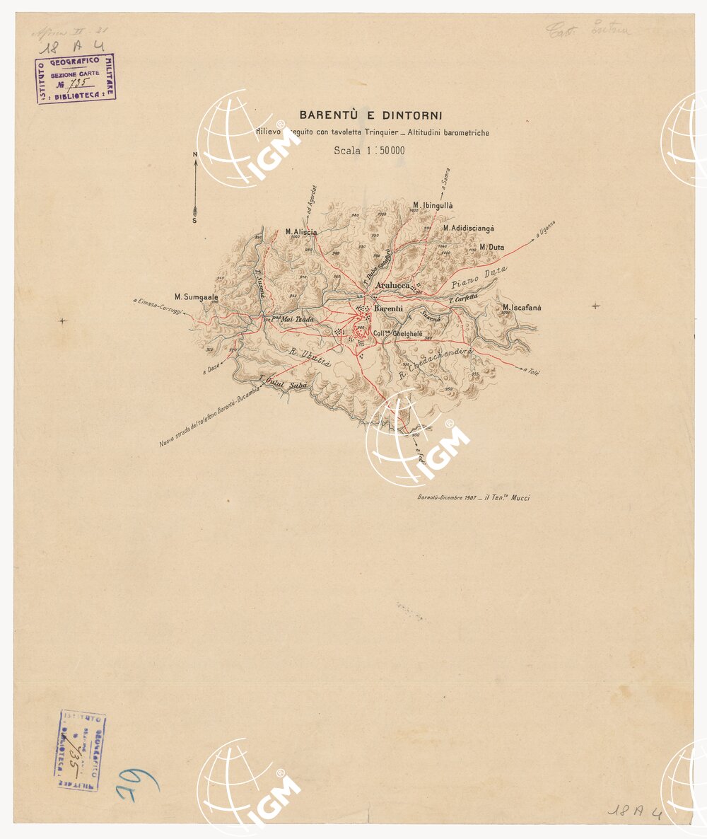 Rilievo eseguito dal Tenente Mucci con tavoletta Trinquier. E’ Stampato a colori con orografia a curve e tratteggio in bistro, rete idrografica in azzurro, strade in rosso. Le altitudine furono calcolate barometricamente.