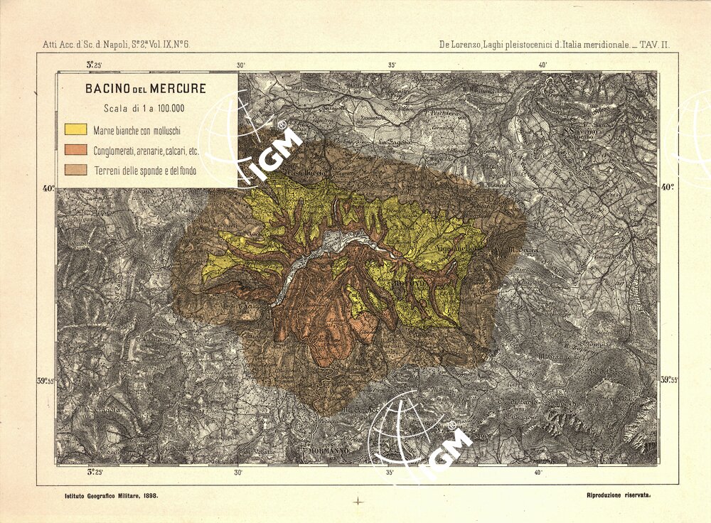 Autore: De Lorenzo, Laghi pleistocenici dell’Italia meridionale. Editore: I.G.M. (FI) Rappresentazione orografica a curve di livello e tratteggio.