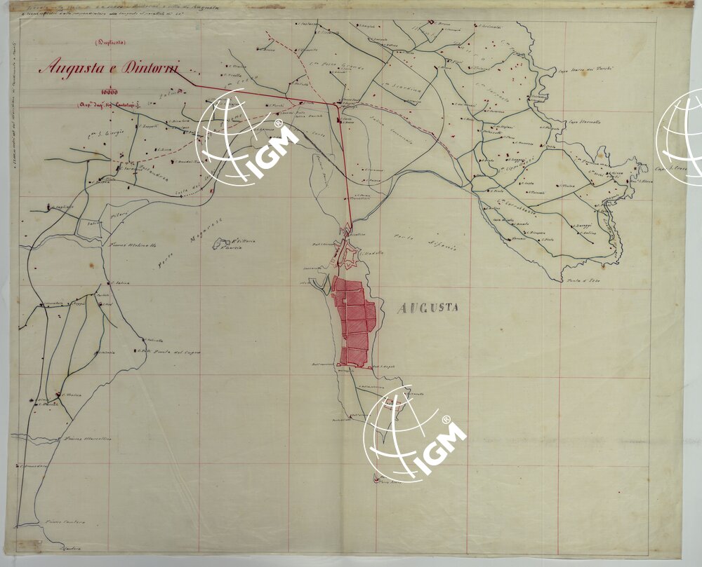 Documento n. 8. Lucido. Rilievo originale eseguito dall’Ing. G. Cantalupi ingegnere del Genio Civile comandato presso lo Sato Maggiore. E’ disegnato a colori azzurro per le acque, rosso per le costruzioni. L’orografia è dimostrata mediante curve di livello tracciate all’equidistanza di 10 metri. Annessi due lucidi e una copia su carta in bianco e nero.