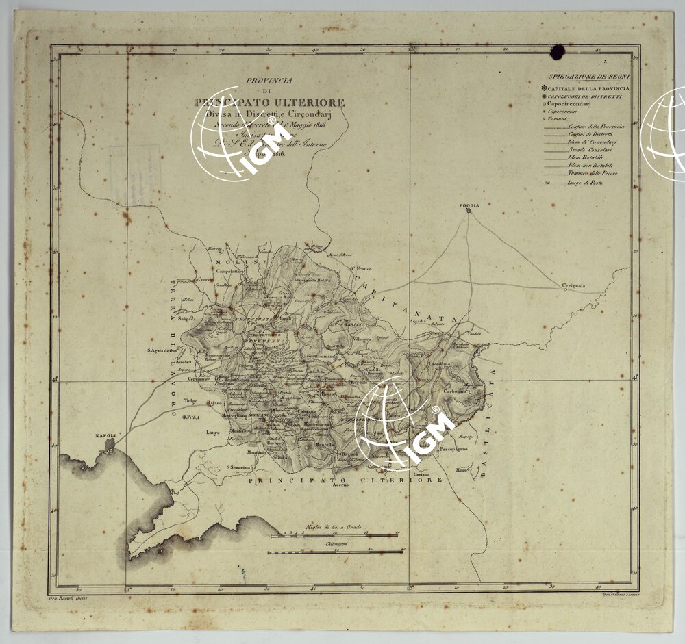 ATLANTE DELLE QUINDICI PROVINCIE AL DI QUA DEL FARO DEL REGNO DELLE DUE SICILIE A NORMA DELLA LEGGE DEL 1° MAGGIO 1816. INCISE D’ORDINE DI S. E. IL SEGRETARIO DI STATO MINISTRO DEGLI AFFARI INTERNI DA GENNARO BARTOLI – PROVINCIA DI PRINCIPATO ULTERIORE.