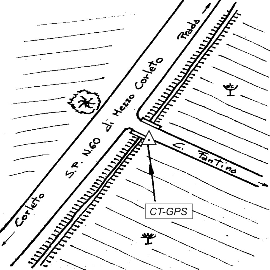 | Materializzazione | Centrino in acciaio inox del tipo "GPS C" infisso nel cordolo di cemento del tombino che consente l'accesso alla Cascina Fantina, lungo la S.P. 60 all'altezza del km 6,700, |