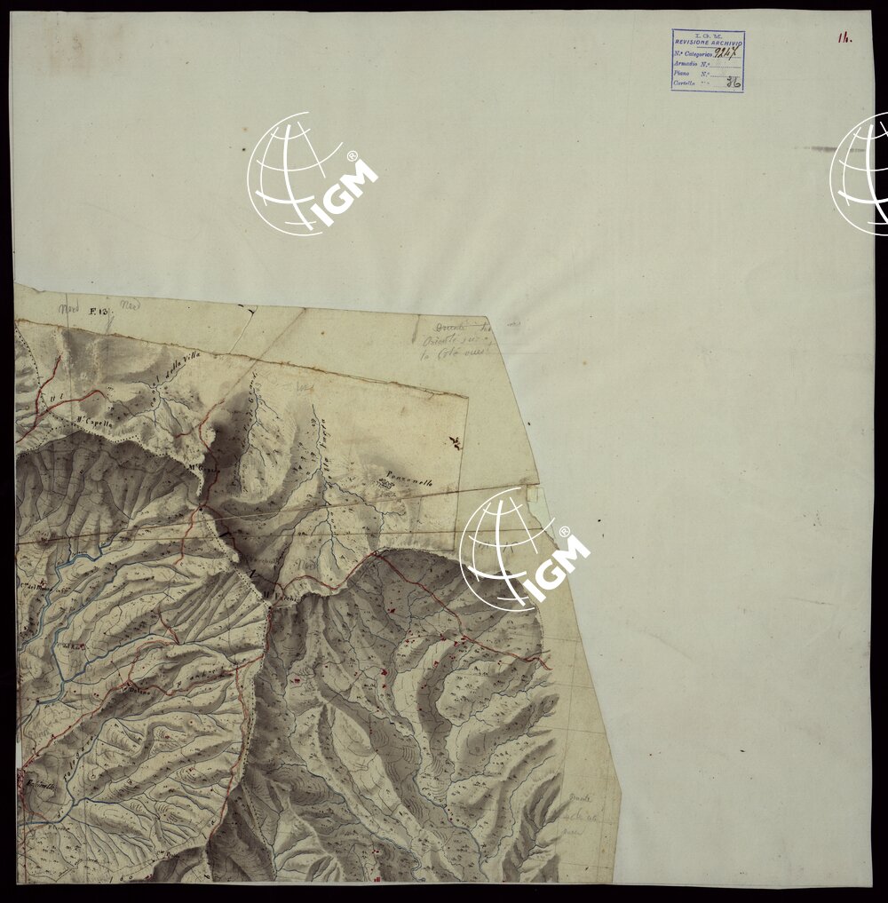 | Note foto | Ventun fogli, e un quadro d'unione, disegnati ad acquerello, a luce obliqua, composti a mosaico e montati su tela. Una nota a lapis sul foglio 5, fa supporre si tratti di rilievi originali di campagna eseguiti dal 1815 al 1816. |