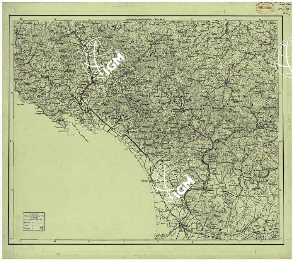 Un foglio montato su cartone. Disegno originale con orografia a curve di livello tracciate alla equidistanza di 100 metri.