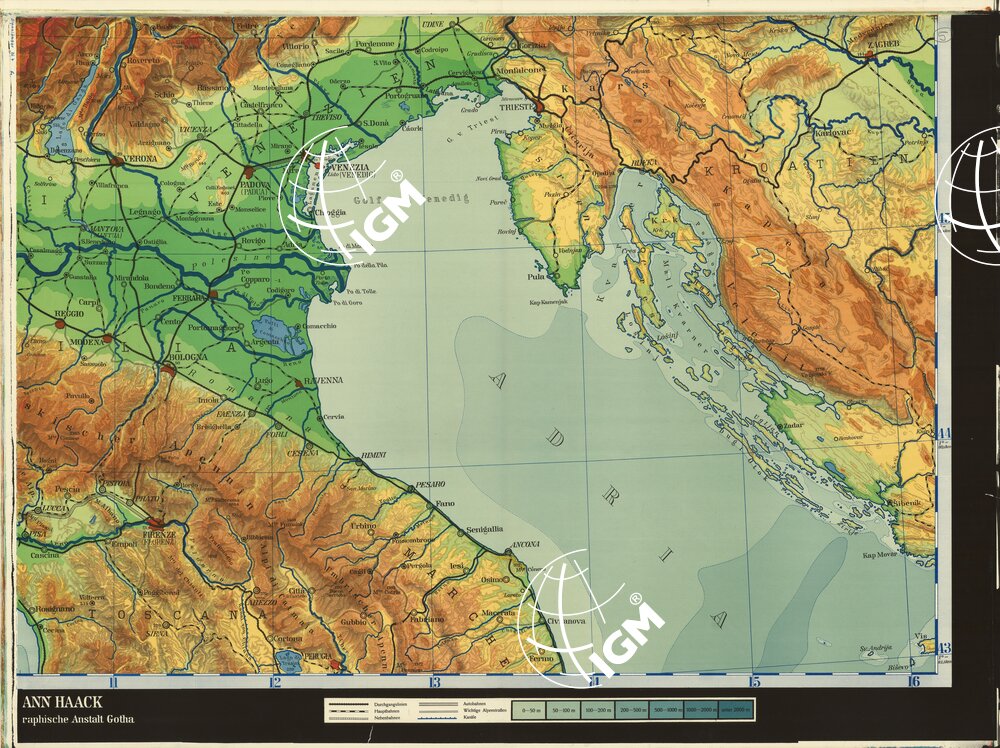 Rappresentazione orografica a tinte ipsometriche. In basso è presente la spiegazione delle tinte ipsometriche. Veb Hermann Haack Geographisch-Kartographische Anstalt Gotha.
