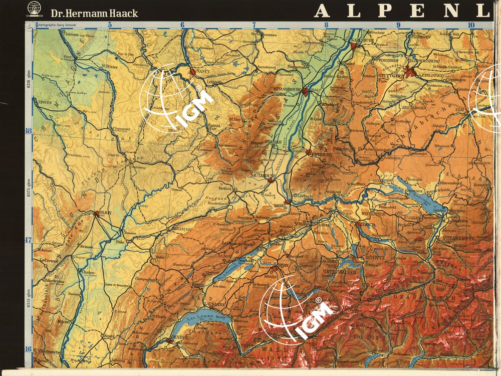 Rappresentazione orografica a tinte ipsometriche. In basso è presente la spiegazione delle tinte ipsometriche. Veb Hermann Haack Geographisch-Kartographische Anstalt Gotha.