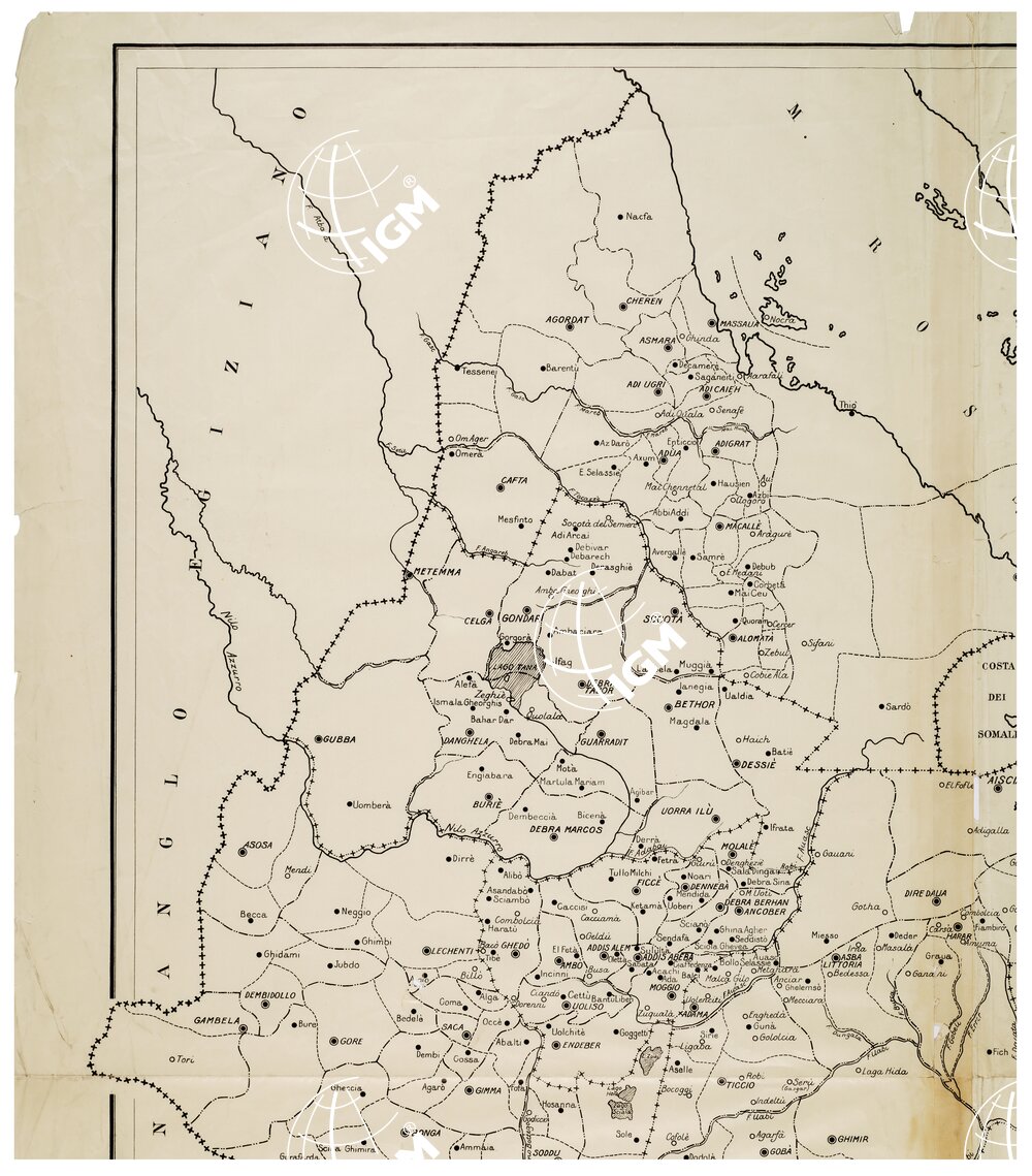 Rappresentazione orografica planimetrica. In basso a destra i segni convenzionali. Governo Gen. A.O.I Stato Maggiore Ufficio Monografie, Addis Abeba. Riproduzione e stampa Ufficio Centrale Topocartografico.