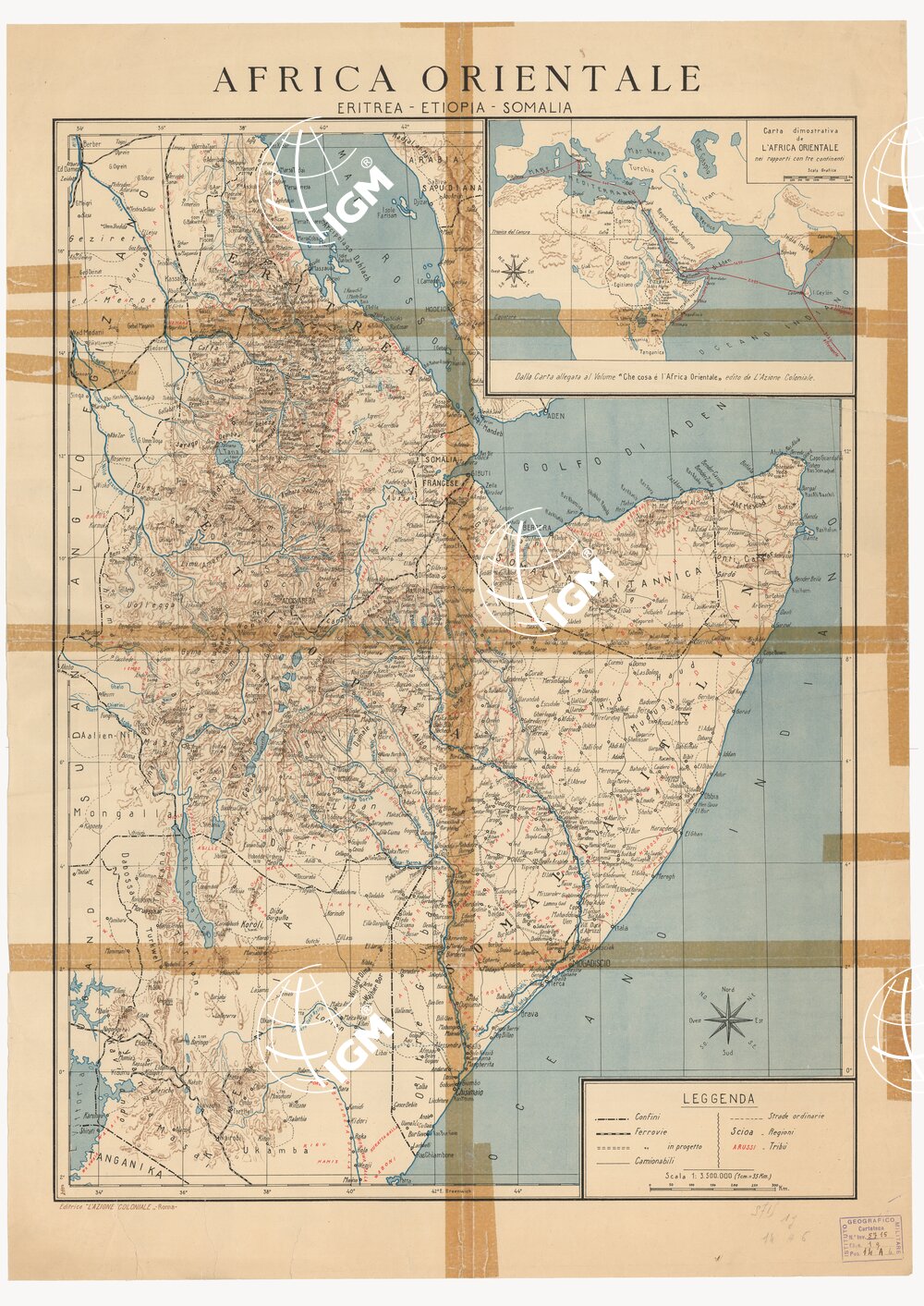 Carta geografica del 1936. Nella parte alta a destra una piccola carta dimostrativa dell’Africa Orientale, nella parte inferiore sempre a destra la Leggenda dei segni. Editrice “L’Azione Coloniale” Roma.