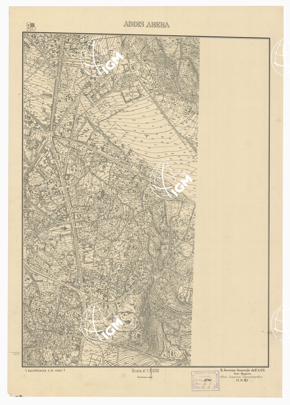 Rappresentazione orografica a curve di livello, l’equidistanza è di metri 1. R. Governo Generale dell’A.O.I. Stato Maggiore Ufficio Superiore Topocartografico (I.G.M.).