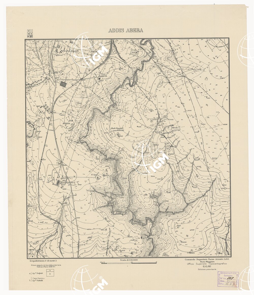 Rappresentazione orografica a curve di livello, l’equidistanza è di metri 5. Rilievo eseguito con tavoletta pretoriana. Comando Superiore delle Forze Armate dell’A.O.I., Ufficio Superiore Topocartografico (I.G.M.).