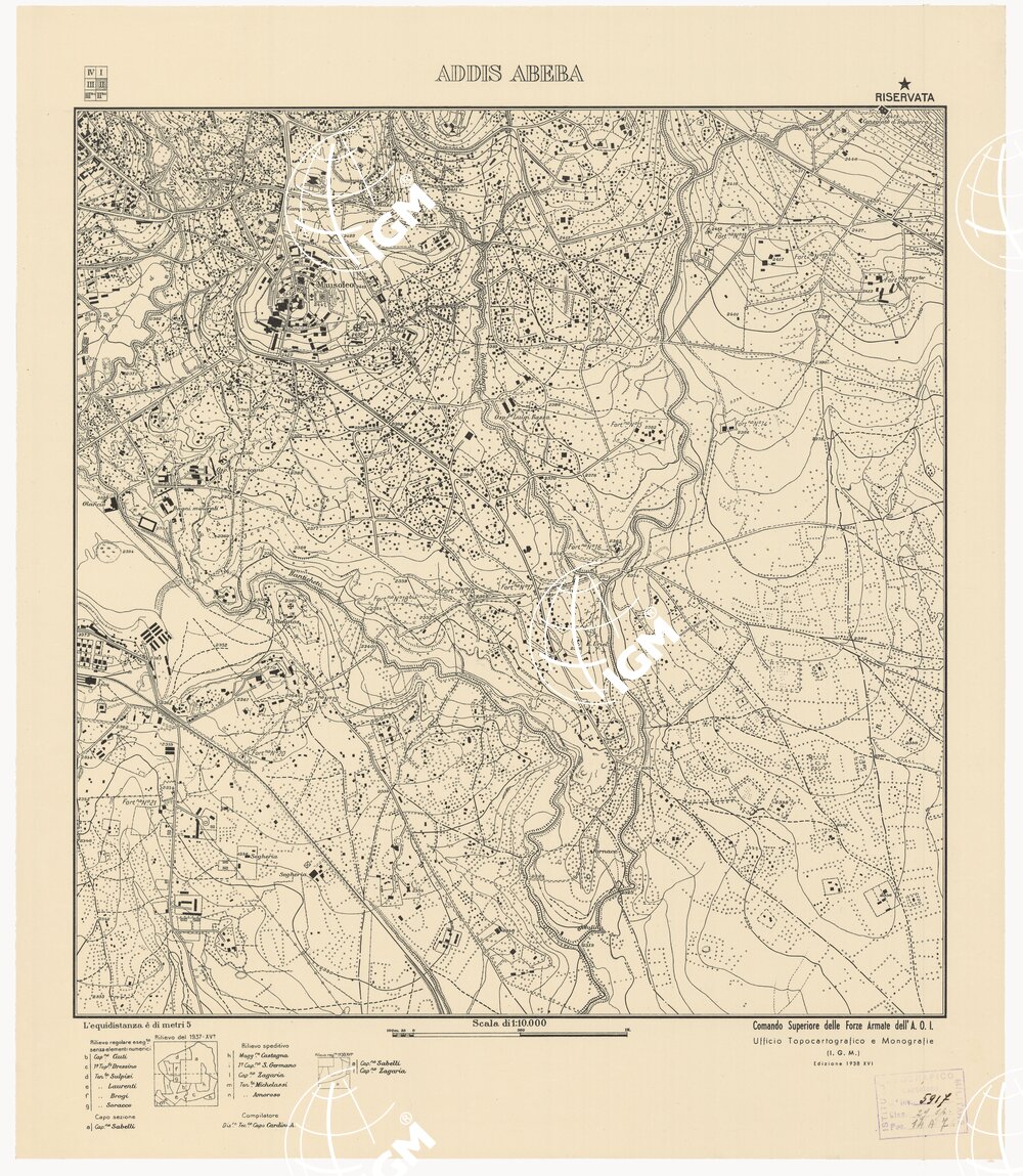 Rappresentazione orografica a curve di livello, l’equidistanza è di metri 5. Comando Superiore delle Forze Armate dell’A.O.I., Ufficio Topocartografico e Monografie (I.G.M.).