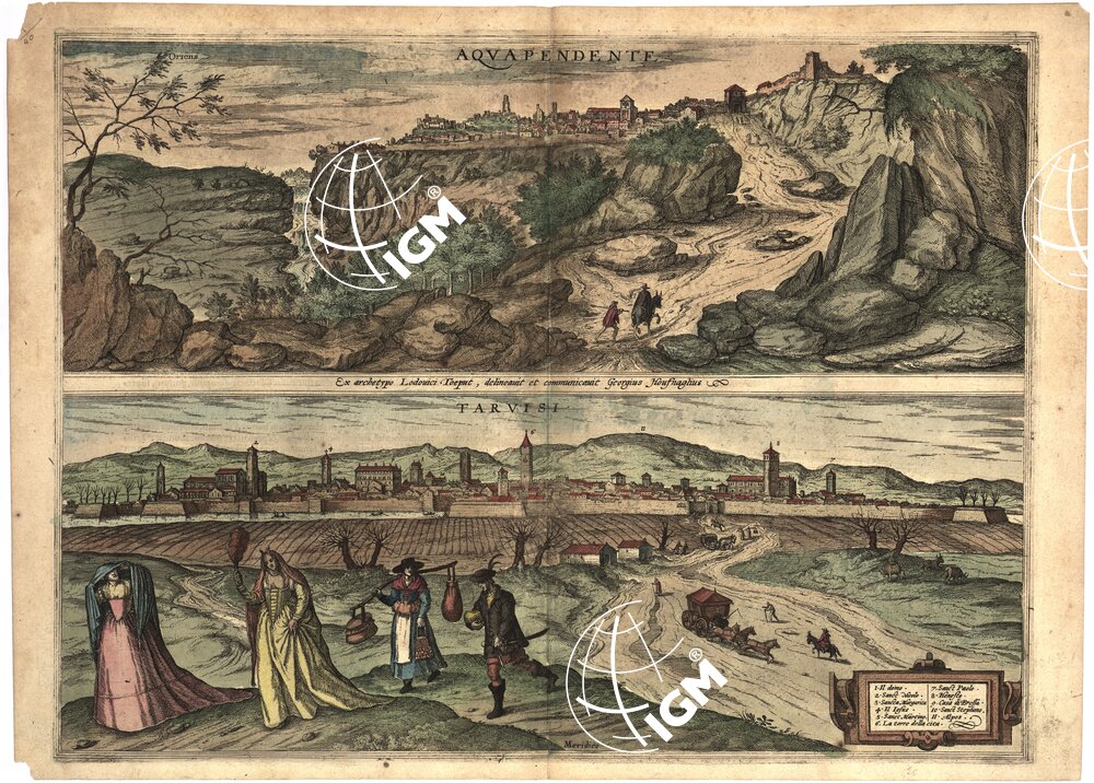 Incisione su rame, coloritura a mano. Grafia Latina. Rappresentazione orografica prospettica. In basso a destra è presente una legenda. Sul retro vi è uno scritto in lingua latina. (A3)