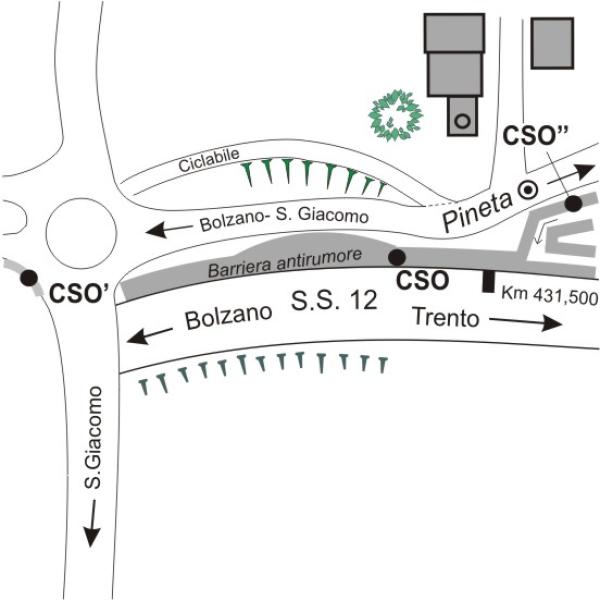 [{"simbolo_contrassegno":"B4","materializzazione":"(CSO) – Centrino universale infisso nel muro delle barriere antirumore lato abitato di Pineta. Il cso si trova in prossimit\u00e0 del passaggio pedonale che conduce al magazzino di frutta a N\/O dell'abitato."},{"simbolo_contrassegno":"B7","materializzazione":"(CSO') – Contrassegno orizzontale di tipo piatto, del Catasto di Bolzano, PF 681-224 posizionato sul marciapiede della rotonda che sovrasta la SS 12 in prossimita dell'uscita per S. Giacomo."},{"simbolo_contrassegno":"B4","materializzazione":"(CSO'') – Centrino universale infisso sulla sommit\u00e0 del muro, lato strada, del passaggio pedonale che conduce al magazzino di frutta, sulla via Steinmann in corrispondenza del Km 431,500 della adiaciente S.S. 12. Coincidente con IGM95 010705."}]