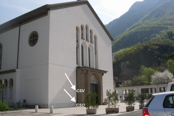 [{"simbolo_contrassegno":"B1","materializzazione":"(CSO) – Bullone infisso sulla facciata a sinistra della porta, nell'angolo formato dal corpo avanzato."},{"simbolo_contrassegno":"V1","materializzazione":"(CSV) – Mensola infissa in corrispondenza del cso."}]