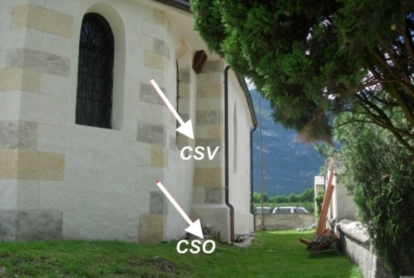 [{"simbolo_contrassegno":"P2","materializzazione":"(CSO) – Chiusino in ghisa posto alla base della facciata nord in prossimit\u00e0 della risega."},{"simbolo_contrassegno":"V1","materializzazione":"(CSV) – Mensola infissa in corrispondenza del cso."}]