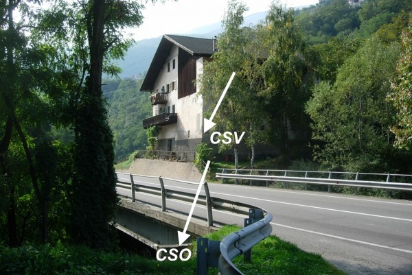 [{"simbolo_contrassegno":"B4","materializzazione":"(CSO) – Centrino universale infisso sul muro di contenimento della scarpata, orografica sinistra del torrente, in prossimit\u00e0 del ponte."},{"simbolo_contrassegno":"V1","materializzazione":"(CSV) – Mensola posta sul lato destro dell'abitazione in prossimit\u00e0 dello spigolo sinistro."}]