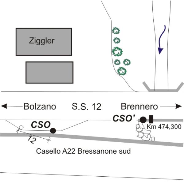 [{"simbolo_contrassegno":"B1","materializzazione":"(CSO) – Bullone infisso sul muro delle barriere antirumore della A22 in prossimit\u00e0 della fermata dell'autobus."},{"simbolo_contrassegno":"B4","materializzazione":"(CSO') – Centrino universale infisso all'inizio del muro in prossimit\u00e0 di un ponticello al Km 474,300."}]