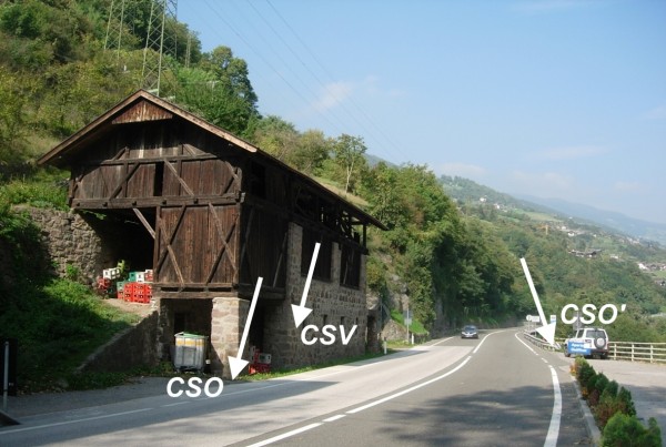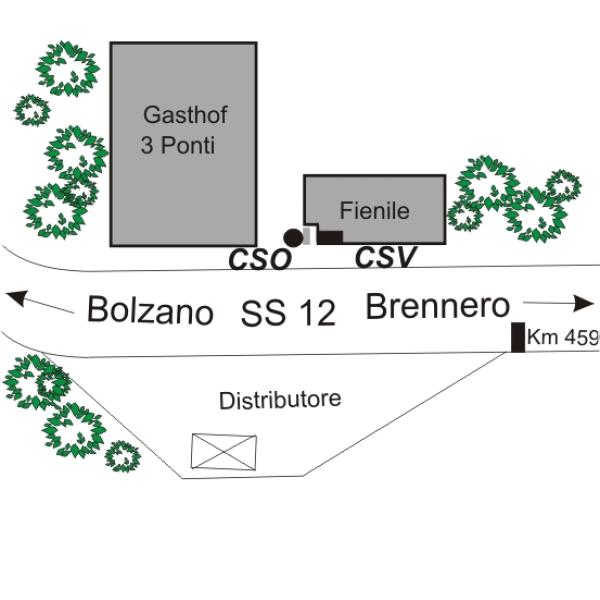 | Contrassegni | [{"simbolo_contrassegno":"P3","materializzazione":"(CSO) – Chiusino in ghisa posto alla base del pilastro sud del fabbricato adibito a fienile. Alla data dell'ultima ricognizione l'Alto risulta non misurabile perch\u00e8 danneggiato."},{"simbolo_contrassegno":"V1","materializzazione":"(CSV) – Mensola infissa sulla facciata, lato strada, presso lo spigolo di sinistra del fienile."},{"simbolo_contrassegno":"B7","materializzazione":"(CSO') – Contrassegno orizzontale di vario tipo piatto, del Catasto di Bolzano, PF 612-108 sul muro di contenimento della strada a nord del distributore, circa 20 cm dal palo della indicazione chilometrica."}] |