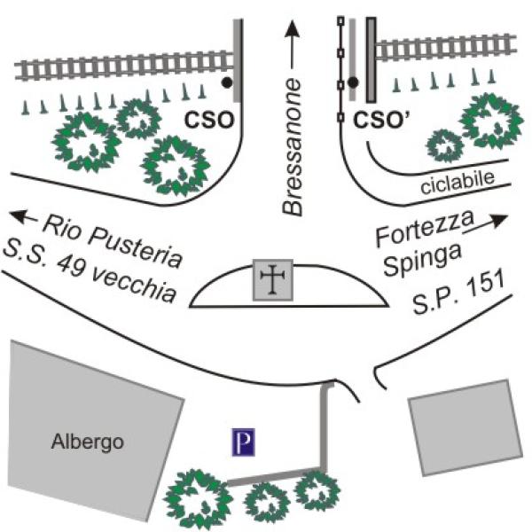 [{"simbolo_contrassegno":"B1","materializzazione":"(CSO) – Bullone infisso nel muro di spalla del ponte, a sinistra della statale, in direzione Bressanone."},{"simbolo_contrassegno":"B4","materializzazione":"(CSO') – Centrino universale Inox infisso sulla sommit\u00e0 del muro di spalla del ponte, a destra della strada, in direzione di Bressanone."}]