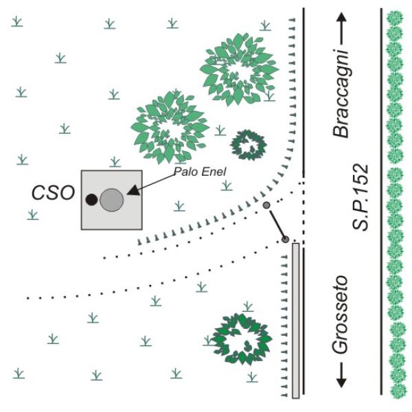 | Contrassegni | [{"simbolo_contrassegno":"B4","materializzazione":"(CSO) – Centrino universale posto alla base del palo Enel, che si trova oltre la spalletta sinistra del muretto laterale sinistro in prossimit\u00e0 del Km.6,800 \"S.P.152\" procedendo in direzione Braccagni."}] |
