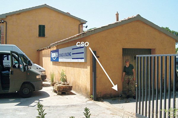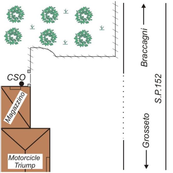| Contrassegni | [{"simbolo_contrassegno":"B1","materializzazione":"(CSO) – Bullone infisso sulla parete esposta a nord, del magazzino, del negozio vendita moto, a sinistra della porta."}] |