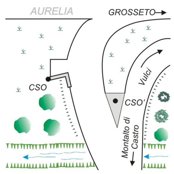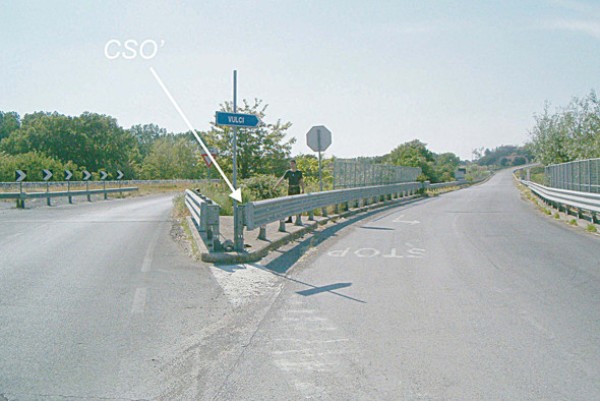 | Contrassegni | [{"simbolo_contrassegno":"B1","materializzazione":"(CSO) – Bullone infisso in testata, su di un muro in cemento armato, posto sul lato sinistro dell'accesso in aurelia proveniendo da Montalto di Castro."},{"simbolo_contrassegno":"B4","materializzazione":"(CSO') – Centrino universale posto al centro della piazzola che divide i due accessi fra ingresso aurelia e l'indicazione Vulci."}] |