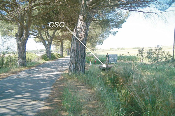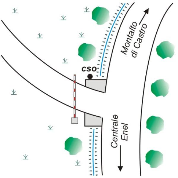 [{"simbolo_contrassegno":"B1","materializzazione":"(CSO) – Bullone infisso a lato di una canaletta, posta sul lato sinistro della strada procedendo in direzione Montalto di Castro."}]