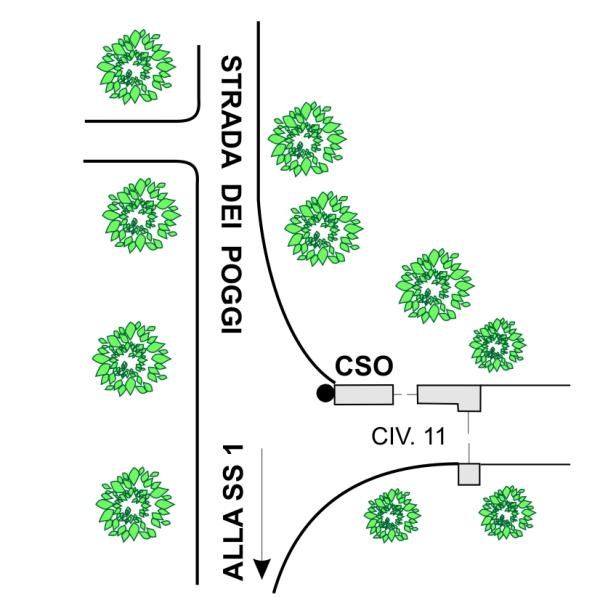 | Contrassegni | [{"simbolo_contrassegno":"B1","materializzazione":"(CSO) – Bullone infisso nella testata del muro della cabina tecnologica a sinistra del cancello di accesso al nr. civ.11 di Strada dei Poggi."}] |