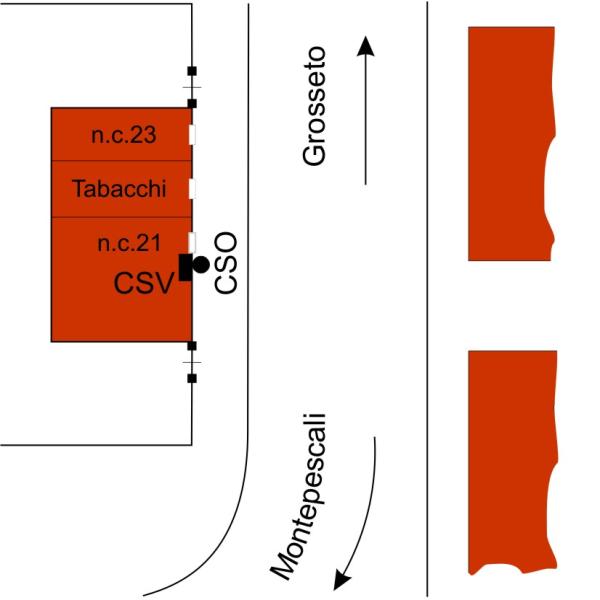 | Contrassegni | [{"simbolo_contrassegno":"P3","materializzazione":"(CSO) – Chiusino in ghidsa a livello del marciapiedi, a 40 cm dallo stipite sinistro della porta principale al n.c 21"},{"simbolo_contrassegno":"V1","materializzazione":"(CSV) – Mensola sulla facciata, a m 1,40 dallo stipite sinistro dsella porta suddetta"}] |