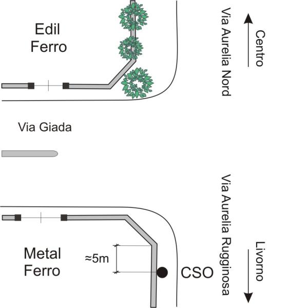 | Contrassegni | [{"simbolo_contrassegno":"B1","materializzazione":"(CSO) – Bullone infisso nel muretto di cinta, a 5 m dallo spigolo destro, dello stabilimento \"Metal Ferro\", in corrispondenza dell'incrocio di via Aurelia rugginosa con via giada."}] |