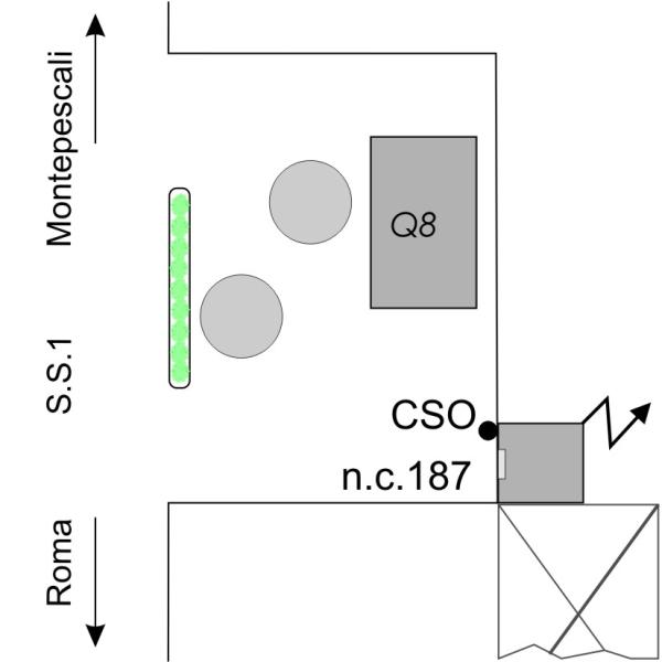 | Contrassegni | [{"simbolo_contrassegno":"B1","materializzazione":"(CSO) – Bullone infisso presso lo soigolo sinistro della cabina ENEL sita nell'area di servizio Q8 a lato di via Aurelia Nord , zona Barbanella."}] |