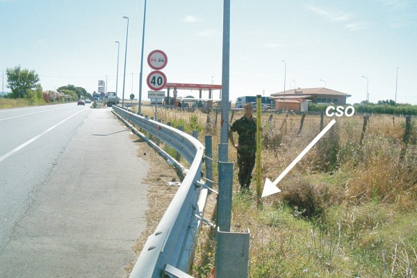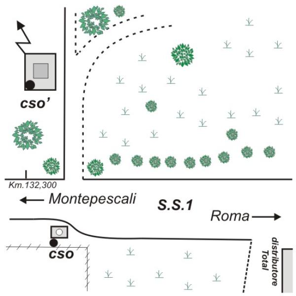 [{"simbolo_contrassegno":"B1","materializzazione":"(CSO) – Bullone infisso nella cassetta di derivazione fili elettrici di un lampione, posto all'inizio della corsia di decellerazione per accedere al distributore Total, sulla destra della statale procedendo da Montepescali."},{"simbolo_contrassegno":"B4","materializzazione":"(CSO') – Centrino universale infisso sullo spigolo posteriore sinistro di una piattaforma su cui \u00e8 costruita una cabina elettrica, ubicata a 50 m. circa dalla SS 1, a sinistra della campestre che si apre proprio di fronte al CSO, dall'altro lato della statale."}]
