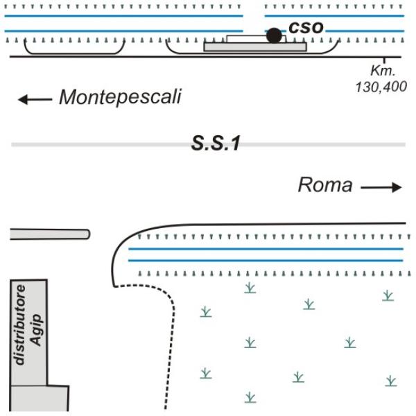 | Contrassegni | [{"simbolo_contrassegno":"B1","materializzazione":"(CSO) – Bullone infisso nella trave del tombino, appena pi\u00f9 in alto di una canaletta di cavi, prima dell'ingresso al distributore \"AGIP\", sulla destra della statale in direzione Montepescali."}] |